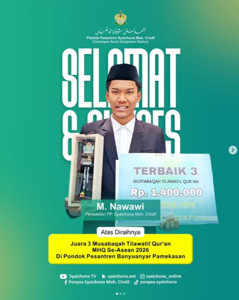Selasa (13/1/2026) – Prestasi membanggakan kembali ditorehkan oleh santri Pondok Pesantren Syaichona Mohammad Cholil. Salah satu santrinya, M. Nawawi, berhasil meraih Juara III Kategori Musabaqah Tilawatil Qur’an (MTQ) pada Even Musabaqoh Hifdail Qur’an (MHQ) Se-ASEAN yang diselenggarakan di Pondok Pesantren Banyuanyar, Pamekasan, Madura